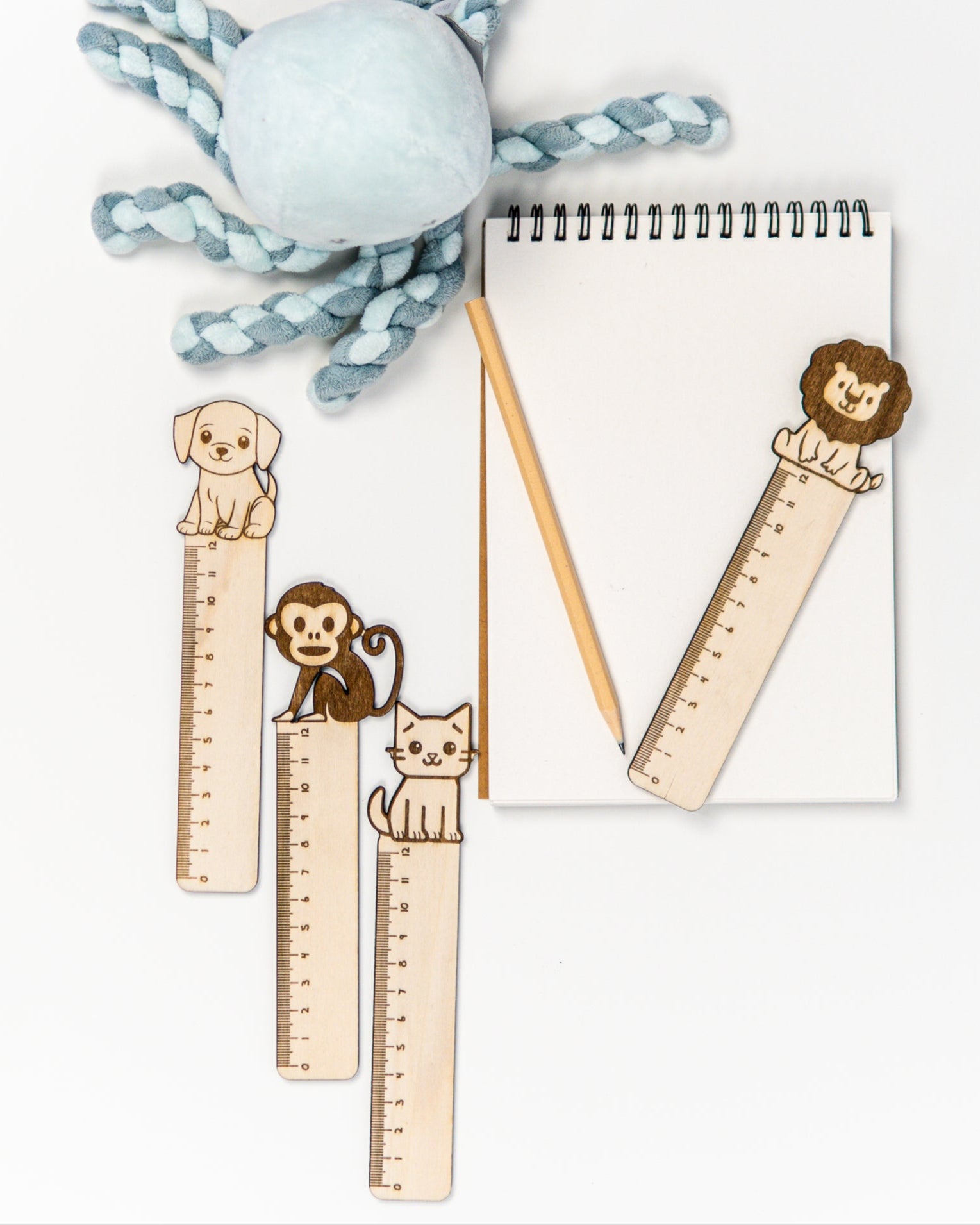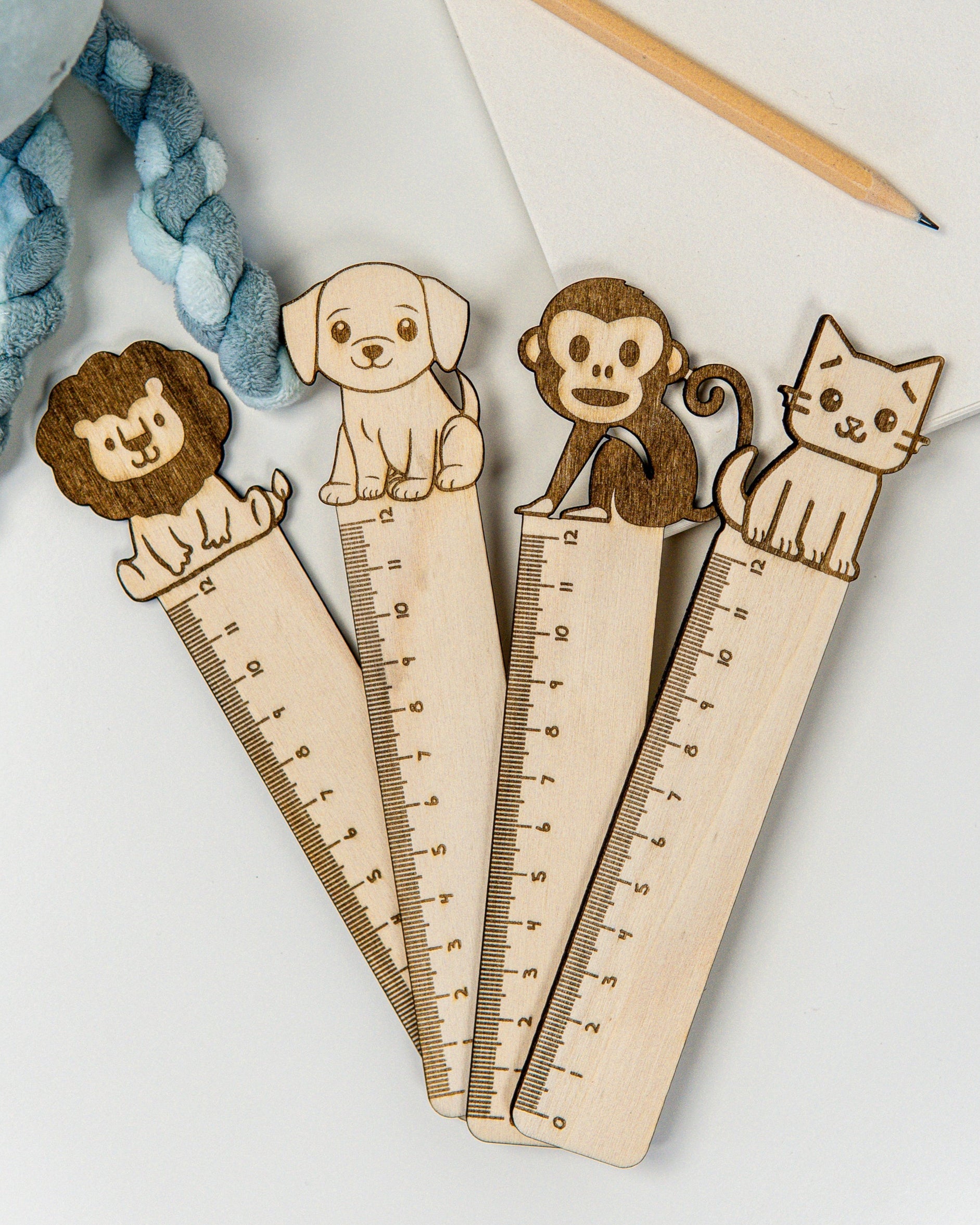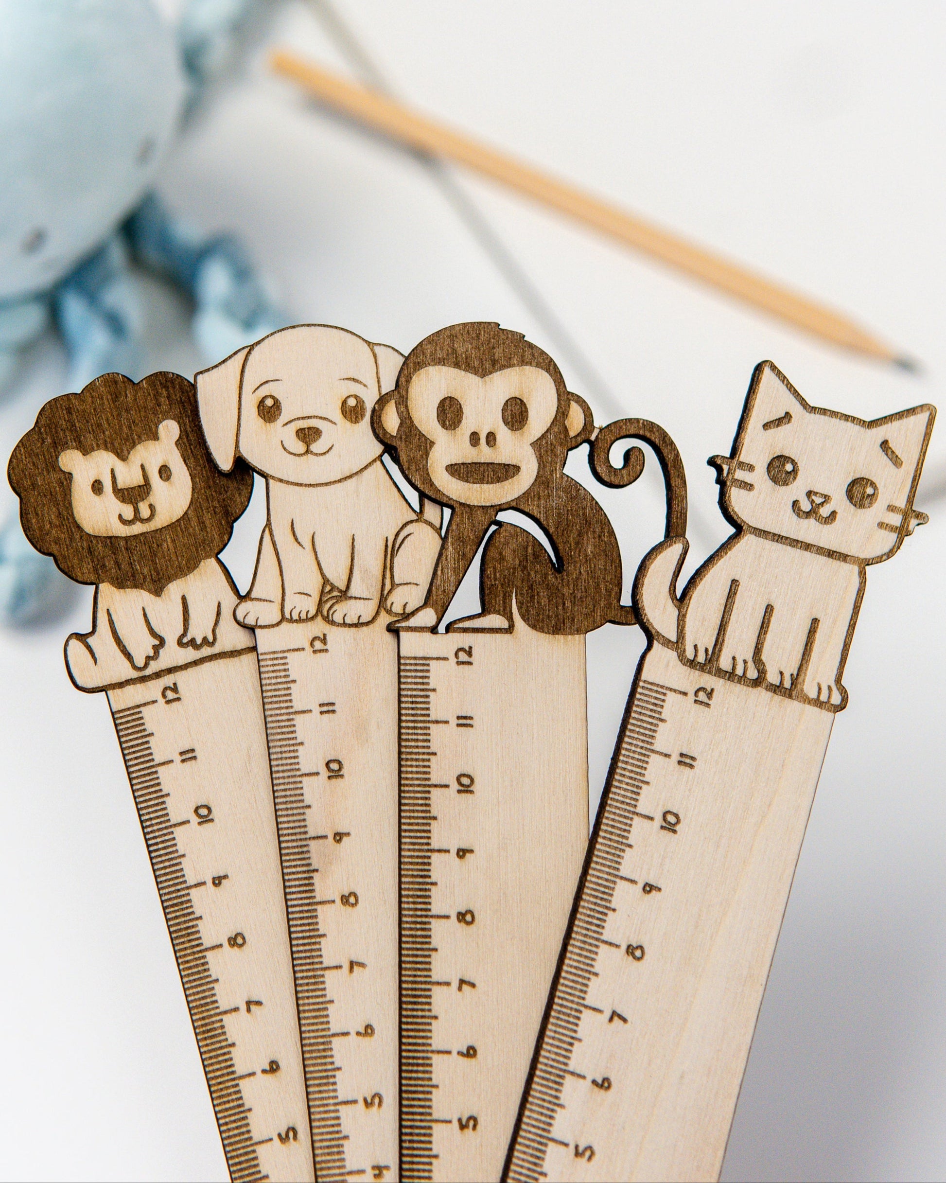 Torna o momento de aprender ainda mais divertido com esta régua escolar em madeira natural, com 12 cm e um encantador detalhe em forma de animal no topo.